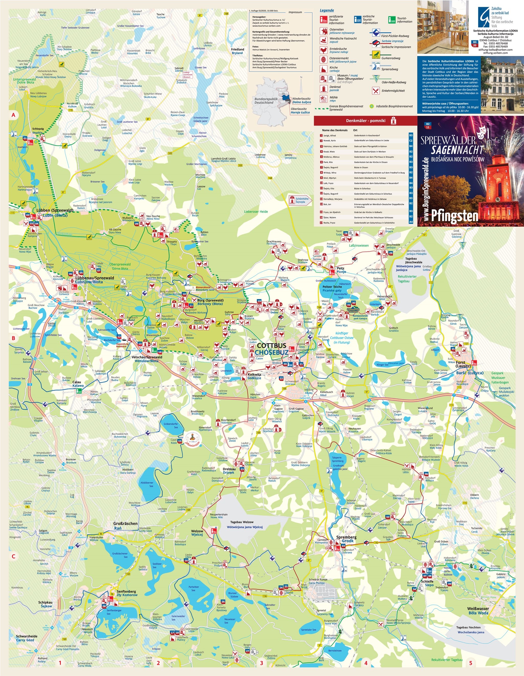 Ende 2019 und Anfang 2020 erschienen unsere beiden Übersichtskarten "Unterwegs bei den Lausitzer Sorben/Wenden", in denen die vielfältigen touristischen Angebote sorbischer Unternehmen, Kleinbetriebe und Institutionen aufgezeigt werden. Darüber hinaus bieten sie uns die Möglichkeit, unseren Radweg "Sorbische Impressionen" darzustellen. Die Karten sind weitere wichtige Materialien zur Präsentation auf Tourismusmessen und in den Tourist Informationen.